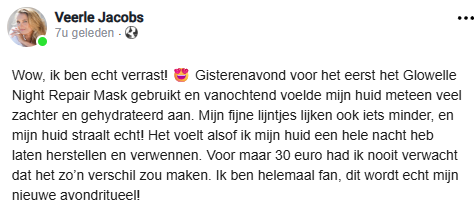 Ik ben echt verbaasd over hoe snel dit werkt! Ik had de laatste maanden veel last van een droge, gevoelige huid en niets leek te helpen. Maar na slechts één nacht met het Glowelle Night Repair Mask merkte ik meteen verschil. Mijn huid voelde minder trekkerig, veel zachter en echt een stuk sterker aan. Het is bijna niet te geloven dat een product mijn huidbarrière zo kan herstellen. Glowelle zegt dat het de huidbarrière tot wel 90% herstelt binnen 8 uur, en eerlijk… dat is precies hoe het voor mij voelt. Mijn huid straalt weer, ziet er frisser uit en ik voel me eindelijk weer zelfverzekerd als ik ’s ochtends in de spiegel kijk. Ik had dit echt eerder willen ontdekken!